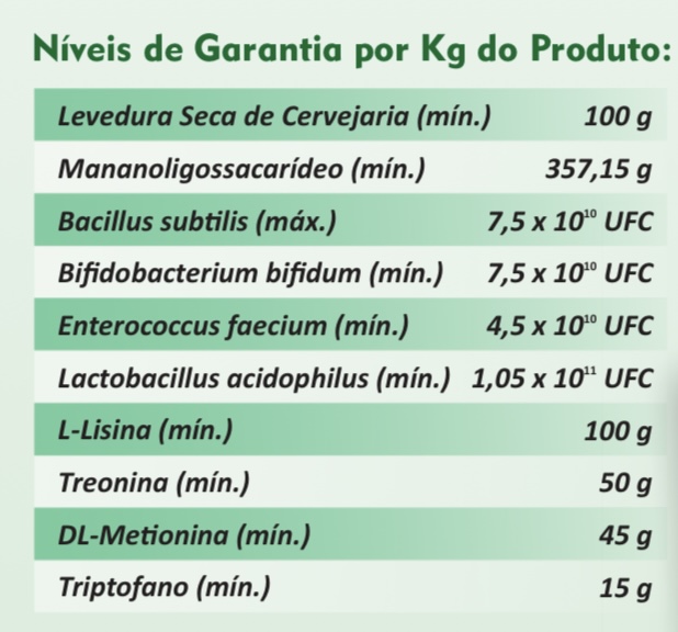Modo de Uso: Fornecer adicionado à ração. As doses diárias devem ser divididas em duas ou três doses ao dia.